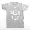 White ink on a heather grey poly-cotton shirt. Sail on, sail on.